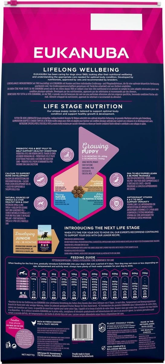 Eukanuba’s beste Puppyvoer voor grote rassen, aanbevolen voor grote honden zoals Duitse herders, labradors, rottweilers en golden retrievers. Omdat Puppy’s van grote rassen zo snel groeien, is dit hondenvoer ontwikkeld met speciaal afgestemde hoeveelheden energie, calcium en fosfor voor de optimale groei van botten en gewrichten. Ook bevat de voeding een optimale verhouding van omega-6- en omega-3-vetzuren voor een gezonde huid en een glanzende vacht voor uw pup, en dierlijke eiwitten (kip is het belangrijkste bestandsdeel) die helpen bij de ontwikkeling van sterke, soepele spieren. Van de DHA is bovendien klinisch bewezen dat deze helpt bij de ontwikkeling van slimme, goed te trainen Puppy’s. Eukanuba Puppy & Junior droge hondenvoeding voor grote rassen is ontwikkeld in samenwerking met dierenartsen en wordt aanbevolen door topfokkers*. Het bevat 100% van de voedingsstoffen en is helemaal uitgebalanceerd om uw pup gezond te helpen groeien.