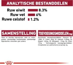 | Analytische bestandsdelen | analytische bestanddelen: ruw eiwit: 8,3% – ruw vet: 6,0% – ruwe as: 1,9% – ruwe celstof: 1,2% – vochtgehalte: 78,5% – vitamine e:150,0mg/kg. |
