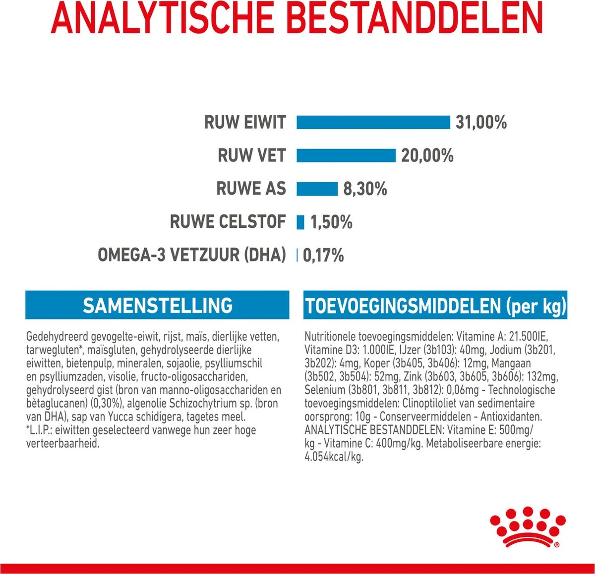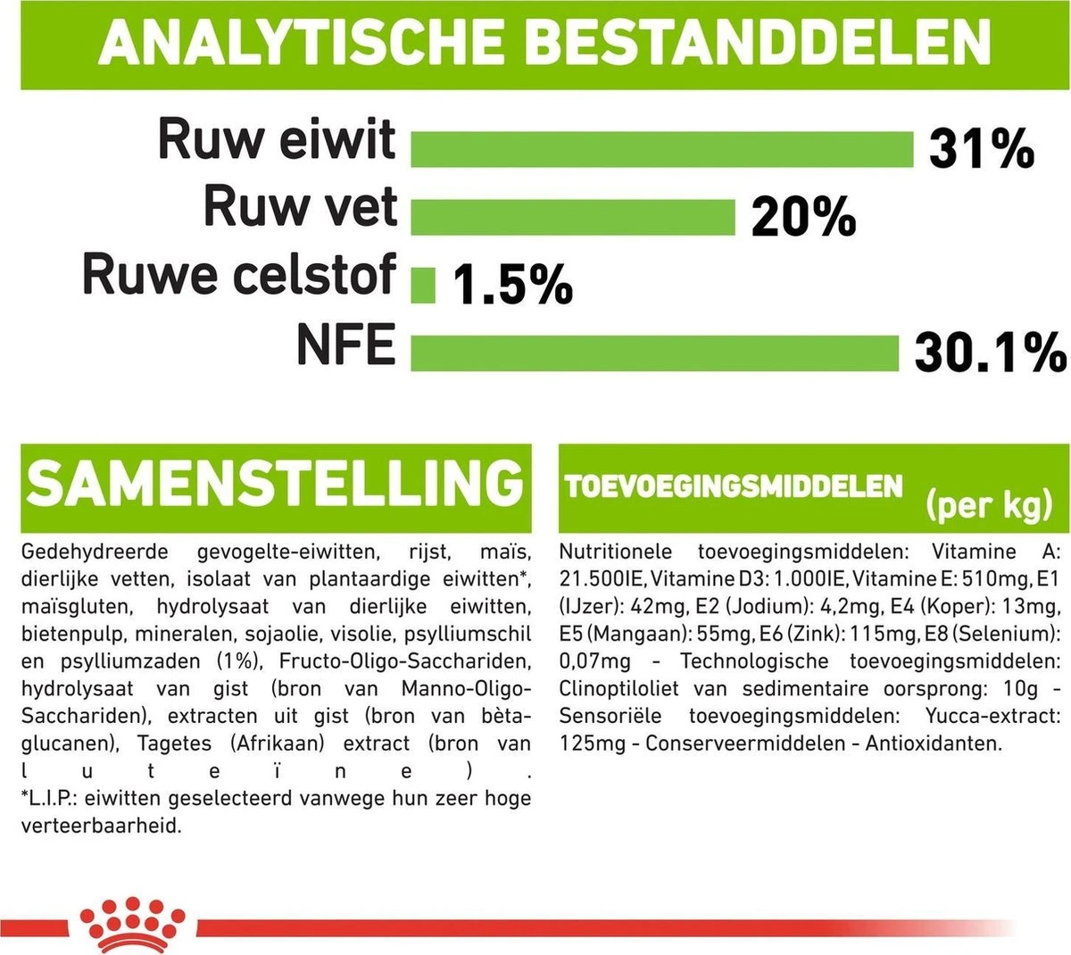 | Voedingswaarde | Samensteling: gedehydreerd gevogeltevlees, rijst, maïs, dierlijke vetten, isolaat van plantaardige eiwitten*, maïsgluten, hydrolysaat van dierlijke eiwitten, bietenpulp, mineralen, sojaolie, psylliumschil en psylliumzaden (1%), visolie, Fructo-Oligo-Sacchariden, hydrolysaat van gist (bron van Manno-Oligo-Sacchariden), tagetes (Afrikaan) extract (bron van luteïne) |