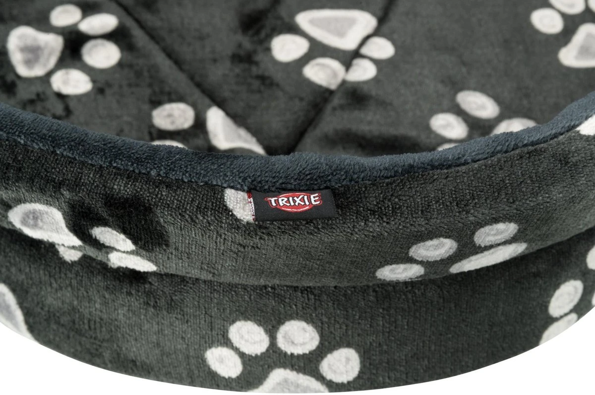 De Trixie Mand Jimmy Ovaal Zwart Met Pootprint 44 x 35 cm is een zachte hondenmand met opstaande rand en lage instap, met schuimrubber vulling, wendbaar kussen en slipvaste onderkant. Deze mand biedt jouw hond een fijne plek om in weg te kruipen. Mand Jimmy heeft een opstaande rand met schuimrubber vulling, bekleed met zacht pluche voor meer comfort en een veilig gevoel. De lage instap zorgt ervoor dat ook honden die kleiner zijn of slecht ter been zijn gemakkelijk de mand in kunnen stappen. De mand is voorzien van een wendbaar kussen en een slipvaste onderkant. Hierdoor wordt voorkomen dat de mand verschuift bij het in- en uitstappen.